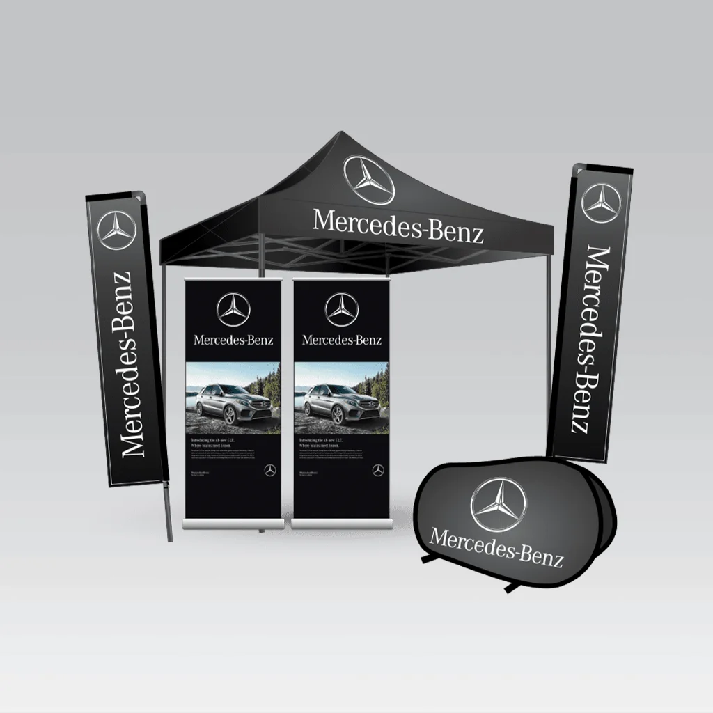 Branded gazebos,flags and banners come in different sizes and materials.For the gazebos you can find steel frames which are quite heavy but cheaper while aluminium frames are lighter but cost a little bit more than the steel frames.